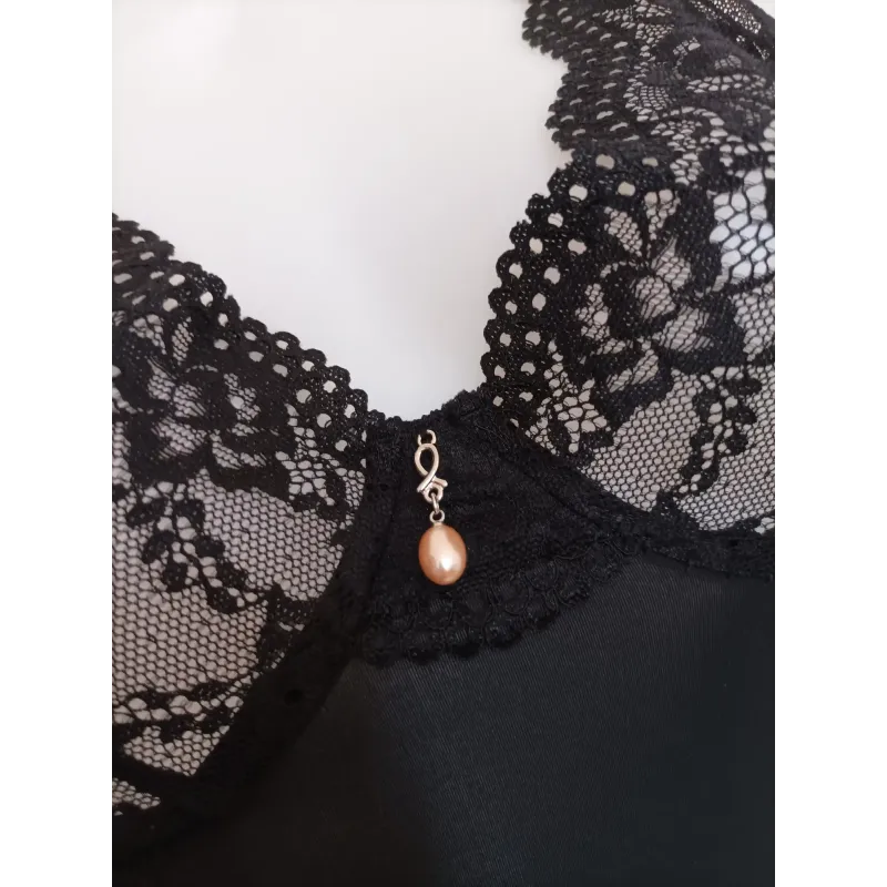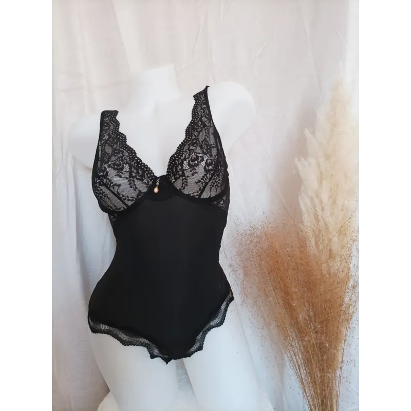 Laissez-vous charmer par le body Luvae, une pièce qui associe l'élégance d'une dentelle délicate sur le buste à la douceur d'une maille opaque qui galbe le corps. Une lingerie féminine, rehaussée d'un bijou perlé discret.