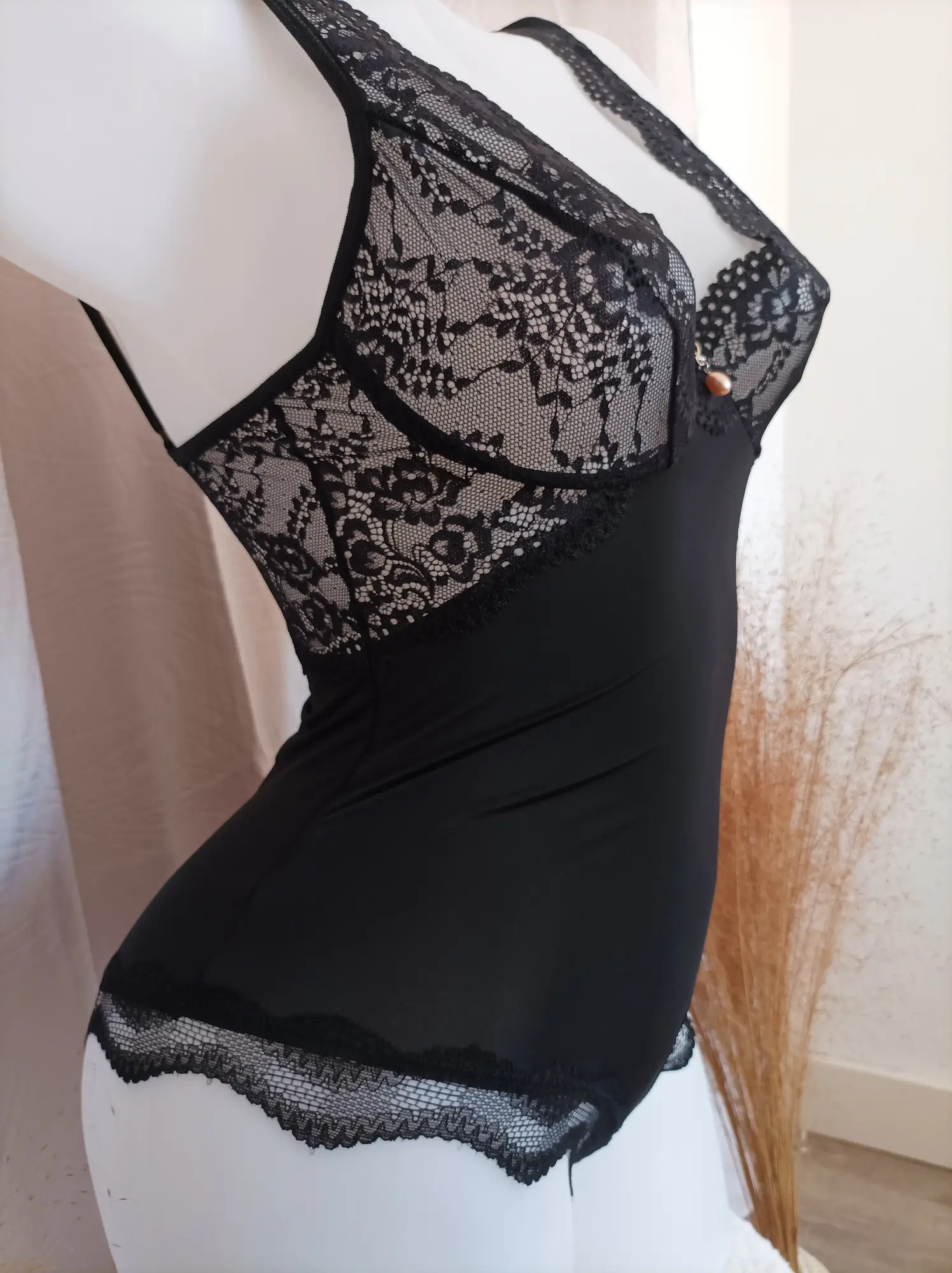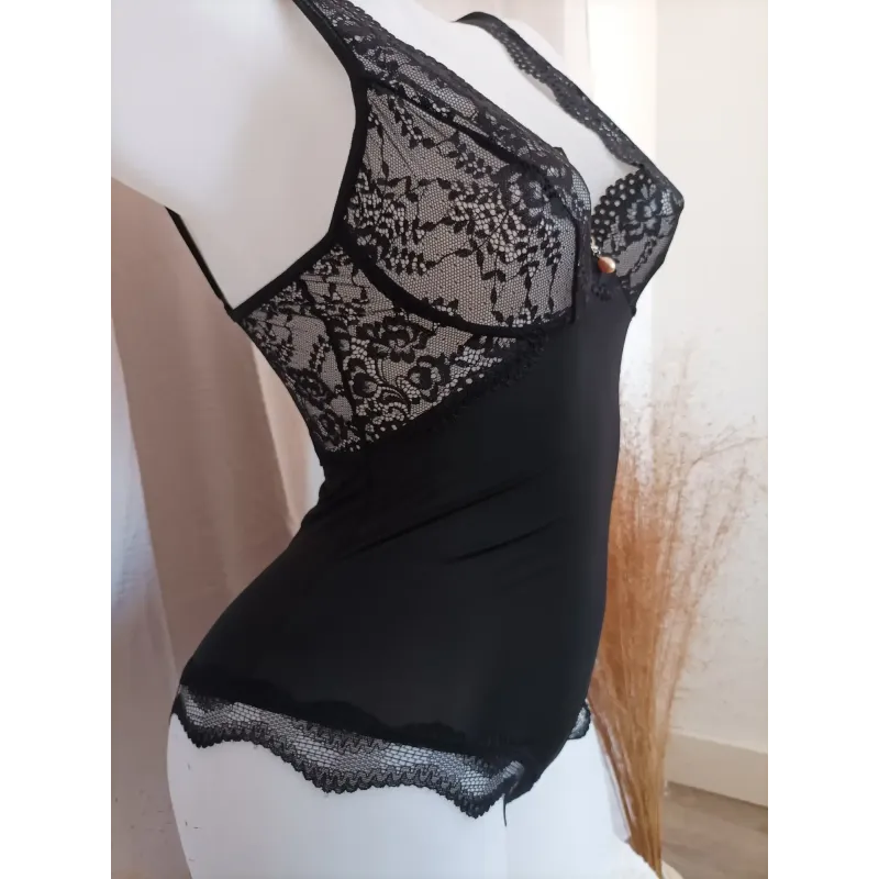 Le body Luvae joue sur le contraste des textures. Le buste en jolie dentelle légèrement transparente, et le reste du corps en tissu doux et opaque. Une perle beige discrète au creux du décolleté qui rend le tout vraiment élégant. C'est une pièce à la fois séduisante et raffinée.