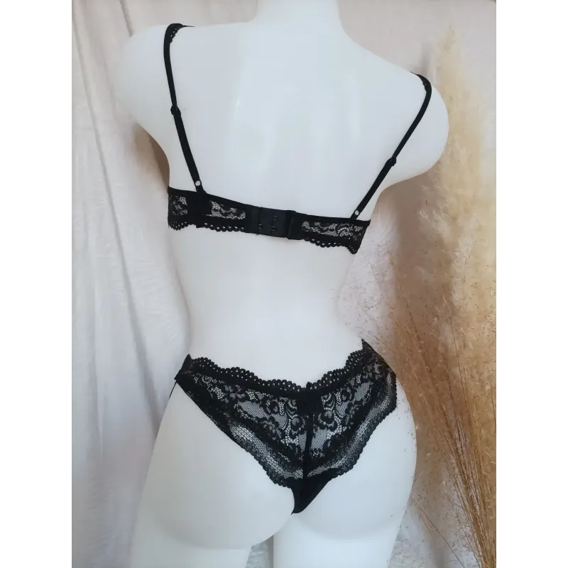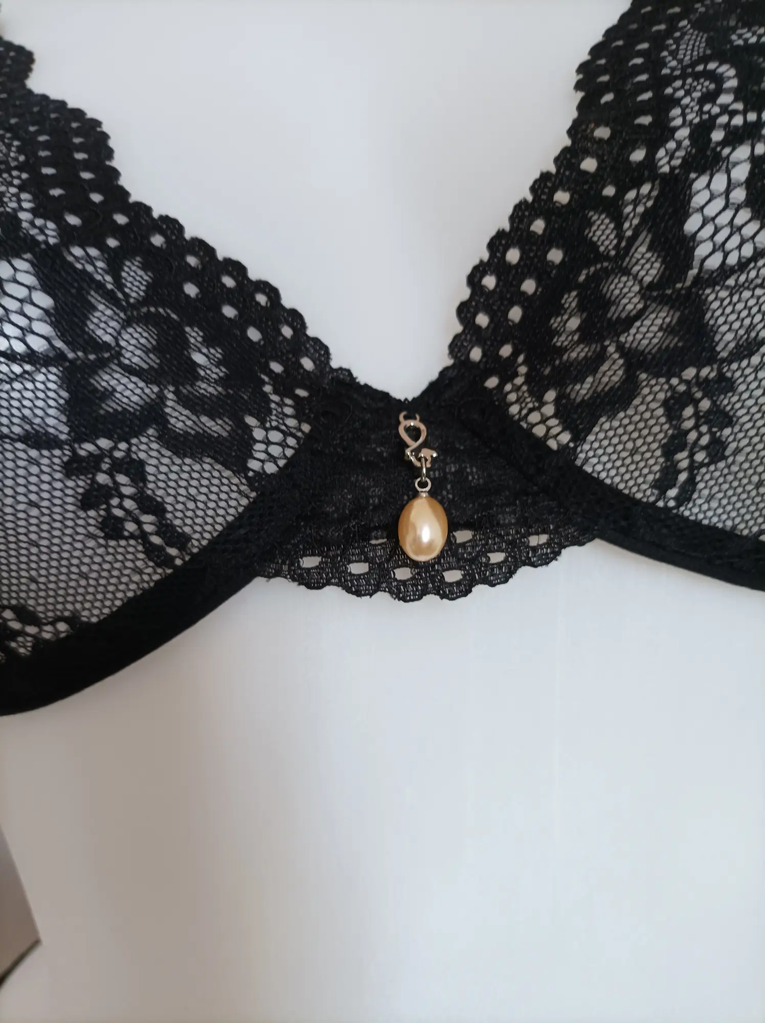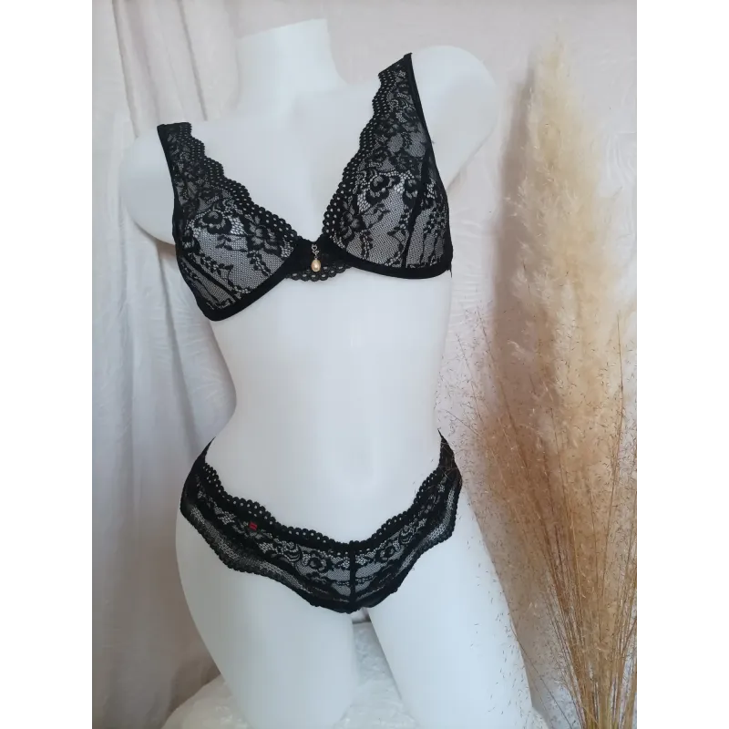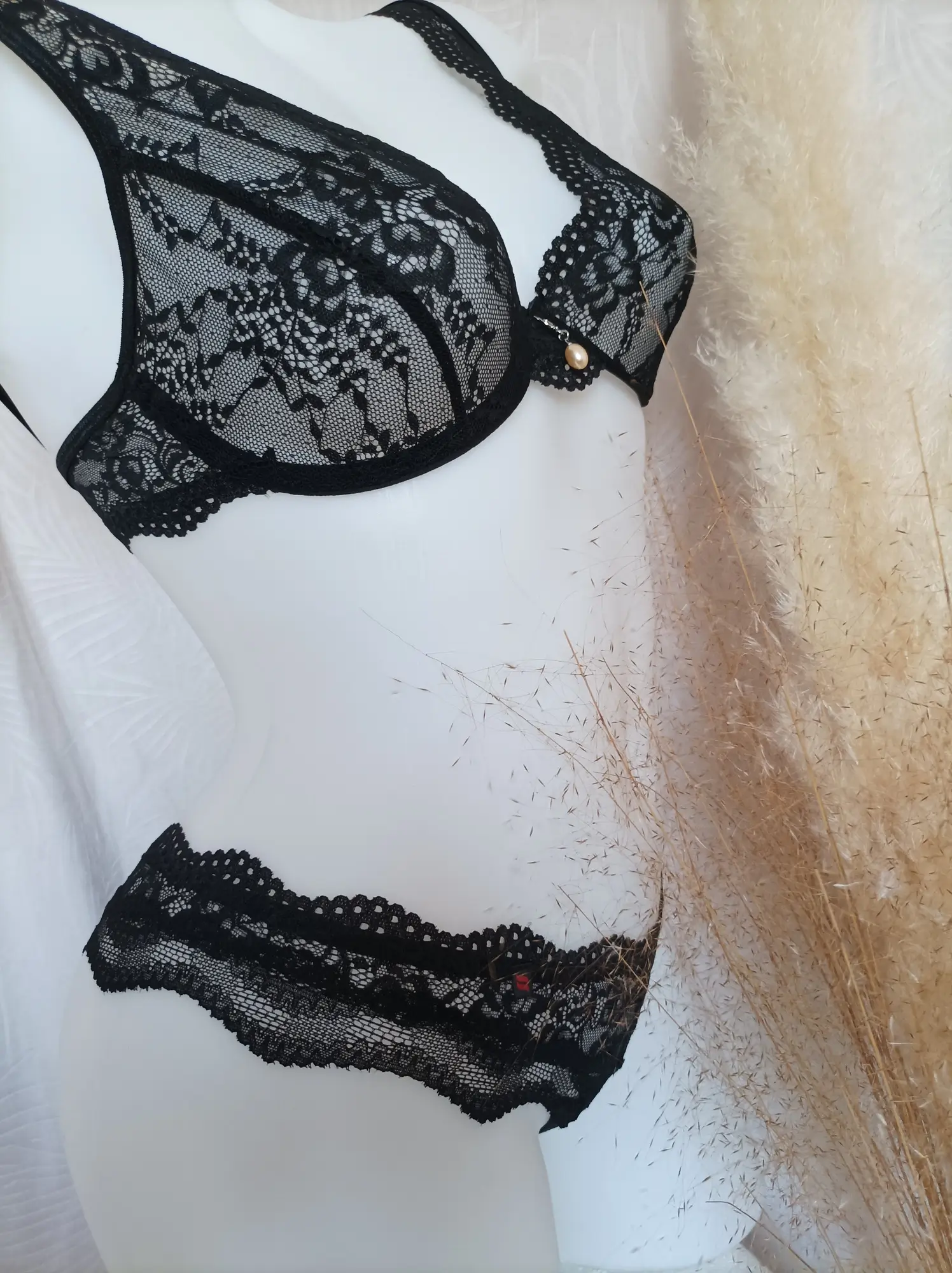 L'ensemble Luvae a un style séduisant, une coupe originale et une dentelle délicate, le tout dans un noir profond. Le bijou perlé entre les bonnets apporte une touche raffinée.