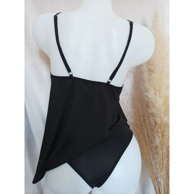 Le haut du buste avec sa tulle en fine broderie et le reste en maille opaque unie, amènent un joli contraste Le pendentif au décolleté apporte la touche finale. Le tanga assorti reprend la même élégance.
